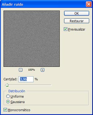 3. Nos aseguramos que la capa activa es la recién creada Capa 1. 4. Filtro/Ruido/Añadir ruido…