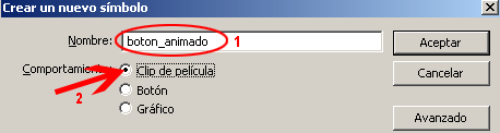 Iniciar creando un nuevo símbolo presionando ctrl. + F8, nombrarlo boton_animado y de comportamiento clip de película.