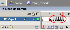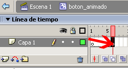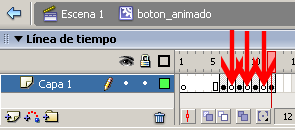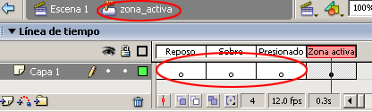 Abrir el botón zona_activa e insertar en los tres estados del botón (Reposo, Sobre y Presionado) fotogramas claves vacíos presionando F7.