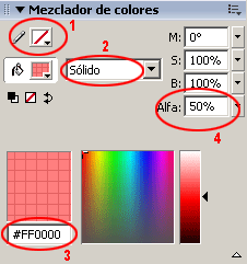 Hacer visible el panel mezclador de colores presionando shift + F9, seleccionar las siguientes características, sin borde, tipo de relleno sólido, número de color #FF0000 y con un alfa al 50 %.