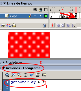 En este punto agregaremos un pequeño código, seleccionar el fotograma número 12, abrir el panel de acciones e insertar gotoAndPlay(6); con esto damos por concluido la animación que insertaremos en el botón nombrado zona_activa.