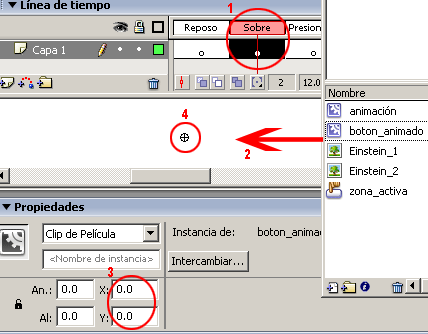 Seleccionar en la línea de tiempo el estado sobre y en este arrastrar desde la biblioteca del clip de película boton_animado, colocarlo en coordenadas X=0 y Y=0. En el punto cuatro de esta imagen se muestra solamente un círculo debido a que en el primer frame del clip de película no se encuentra nada dibujado.