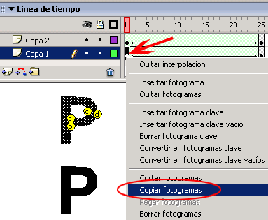 El segundo paso es dibujar nuevamente en el fotograma # 50 las letras del fotograma # 1, la forma más rápida de hacer esto es seleccionando el fotograma # 1 y con el botón izquierdo del mouse (ratón) seleccionar la opción de Copiar fotogramas.