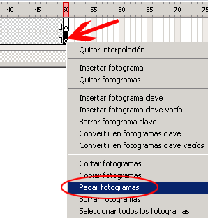 Ahora procederemos a pegar el fotograma copiado. El procedimiento es el siguiente, seleccionar el fotograma # 50 y con el botón izquierdo del mouse (ratón) seleccionar la opción de Pegar fotogramas.