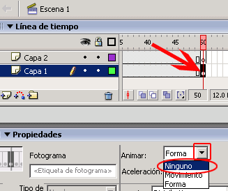 En el siguiente paso quitaremos la animación del fotograma # 50 ya que este fue copiado de un fotograma el cual contenía una animación. Para hacer lo anterior solamente seleccionamos el fotograma # 50 y en la barra de propiedades seleccionar Animar Ninguno.