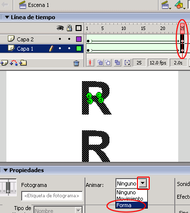 Ya solamente falta agregar los consejos de forma, pro recordar que primero se tiene que hacer la animación, seleccionar el fotograma # 25 de cada una de las capas e insertar Animar Forma