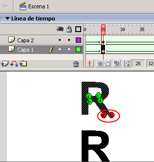 Una vez insertada la animación ya podemos agregar los consejos de forma los cuales deben de ser insertados en el fotograma # 25 de la capa 1. Esto es presionando ctrl. + shift + H o bien Modificar > Forma > Añadir consejo de forma. Agregar 2 consejos de forma los cuales deben de colocarse en la posición marcada en la imagen.