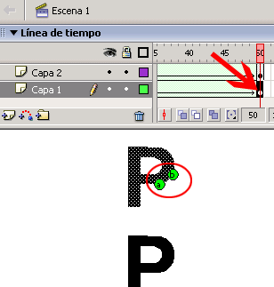 Por ultimo seleccionar el fotograma # 50 para colocar los consejos en la posición que maraca la imagen. En la capa 2 se sigue mostrando como quedaría si la animación no se hace con consejos de forma.