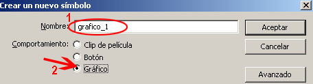 Ahora insertar cuatro símbolos de comportamiento gráfico. Dichos símbolos albergaran a cada una de las imágenes importadas. La ruta para crear los símbolos es ctrl. F8 ó Insertar >> Nuevo símbolo. Al primer símbolo nombrarlo grafico_1 al segundo grafico_2 etc.