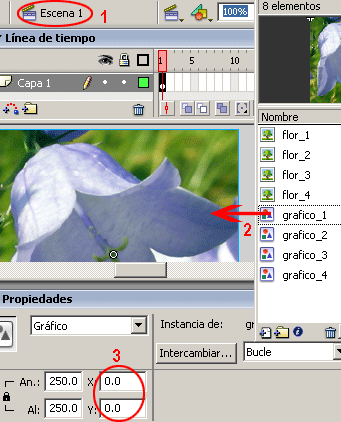 Una vez insertadas las imágenes en sus respectivos símbolos, trasladarnos a la escena ya que es en esta en donde se desarrollara la animación. Arrastrar de la biblioteca el símbolo grafico_1 y colocarlo en coordenadas X=0 yY=0.
