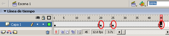 Insertar fotograma clave en el frame 20, 25 y 45. Para realizar esta acción solamente seleccionar el frame indicado y presionar F6 ó Insertar >> Línea de tiempo >> fotograma clave