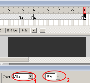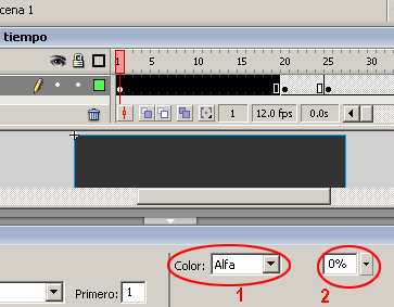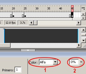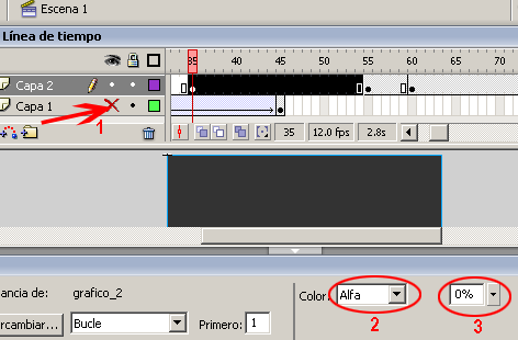 Para evitar algunas compilaciones ocultar la capa 1, ahora seleccionar la imagen del fotograma # 35 y en la barra de propiedades seleccionar Alfa y reducido 0 %.
