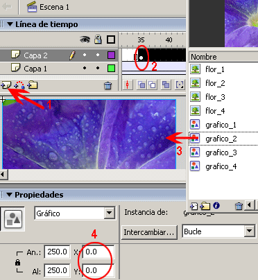 Insertar una segunda capa e insertar un fotograma clave (la ruta ya la saben presionar F6 ó Insertar >> Línea de tiempo >> fotograma clave) en el frame # 35 en este frame arrastrar desde la biblioteca del símbolo grafico_2 y colocarlo en coordenadas X=0 y Y=0.