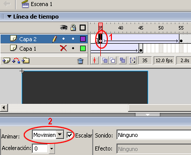 El siguiente paso es crear la animación para la capa 2, seleccionar el fotograma # 35 y en la barra de propiedades seleccionar Animar Movimiento.