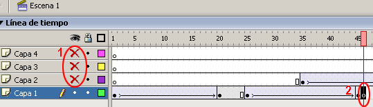 Ocultar las capas 2, 3 y 4, insertar un fotograma clave vacío presionando F7 ó Insertar >> Línea de tiempo >> Fotograma clave vacío en el frame # 46.