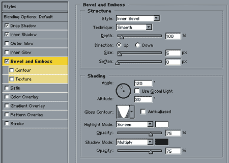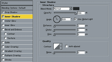 El resto lo haremos con Estilos de Capa (Layer Styles). Imita los parámetros de las tres próximas imágenes.