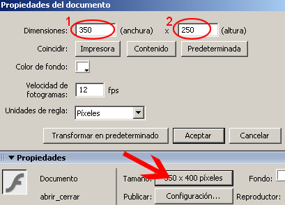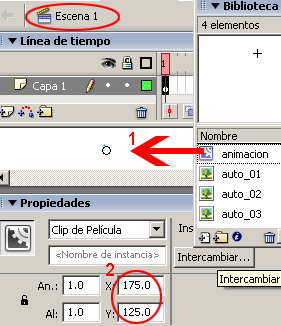Como este trabajo se realizo en un símbolo clip de película, es necesario regresar a la escena y en esta arrastrar desde la biblioteca el símbolo animacion, y colocar el símbolo en coordenadas X=175.0 y Y=125.0. Con esto seda por concluido el tutorial.