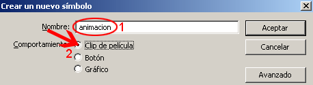 La animación a realizar puede hacerse directamente en la escena, sin embargo, en esta ocasión la animación será insertada en un símbolo el cual tendrá por nombre animacion y de comportamiento Clip de película. Presionar ctrl. + F8 para crear el símbolo.