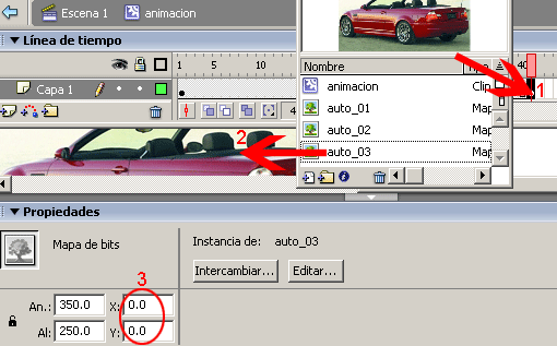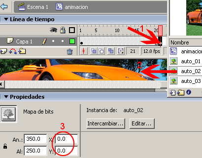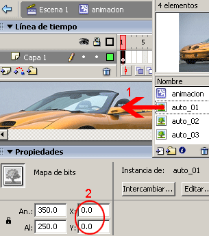Una vez importadas las imágenes, arrastrar la primer imagen en este caso es auto_01 y colocarla en coordenadas X=0.0 y Y=0.0. Las imágenes a importar deberán de tener las mismas dimensiones que el documento o sea 350*250 píxeles.