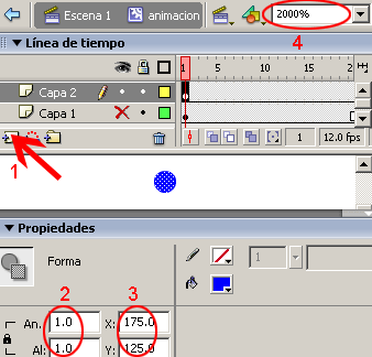 Ahora dar paso a crear la animación de la mascara. Primero insertar una capa dos y ocultar la capa 1 esto con el fin de trabajar más cómodamente posible, en esta capa 2 con ayuda de la herramienta óvalo dibujar un circulo de dimensiones 1.0*1.0 píxeles colocar esta forma en coordenadas X=175.0 y Y=125.0. Para seleccionar esta forma tal vez sea necesario aumentar el área de trabajo (zoom 2000%).