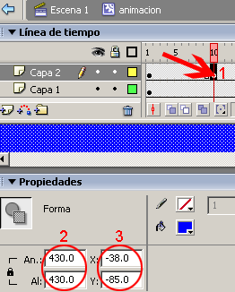 Insertar un fotograma clave vacío (F7) en el frame # 10, y en este fotograma dibujar un circulo de dimensiones 430.0*430.0 píxeles y colocarlo en coordenadas X=-38.0 y Y=-85.0