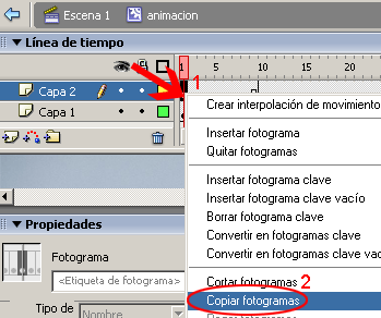 Para no volver a dibujar el circulo pequeño, simplemente seleccionar el primer fotograma y hacer clic sobre el botón derecho del ratón y seleccionar la opción Copiar fotogramas.