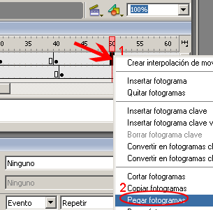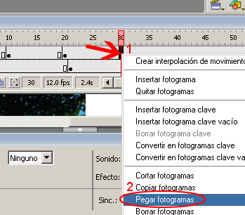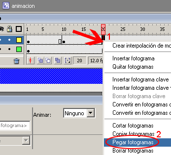 En el siguiente paso seleccionar el frame # 20 y sobre este hacer clic con el botón derecho del ratón y seleccionar la opción Pegar fotogramas.