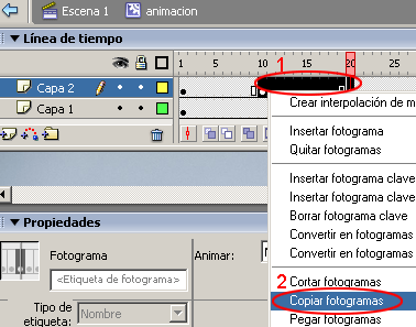 En este paso seleccionar del fotograma # 10 al fotograma # 20, y repitiendo la operación anterior Copiar fotogramas, con esto copiamos tanto el circulo pequeño como el circulo grande. Si tienen problemas en estos pasos (llamar al 911) tal vez ellos puedan ayudarlos jajajajajaja.