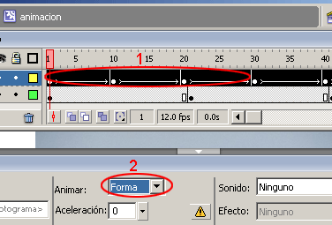 Ha llegado el momento de hacer la animación de los circulitos famosos. Seleccionar el fotograma # 1 al fotograma # 50 (o simplemente hacer clic en la Capa 2), y luego en el panel de Propiedades seleccionar Animar Forma.
