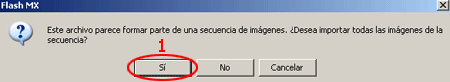 4-. Una vez que se acepta importar la primera imagen Flash MX preguntara que la imagen forma parte de una secuencia de imágenes, luego aceptar importar la secuencia de imágenes
