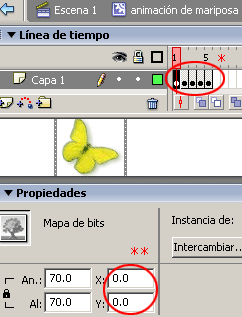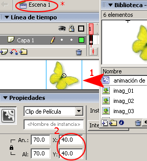 6-. Regresar a la Escena y arrastrar de la biblioteca el símbolo animación de mariposa.