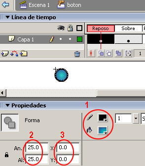 En este paso hacer un circulo de 25.0*25.0 píxeles colocarlo en coordenadas X=0 y Y=0. El color de línea y el color de relleno esta a tú criterio, presionar (F6) para insertar un segundo fotograma y de esta forma hacer un botón de dos estados. Modificar el 2do fotograma.