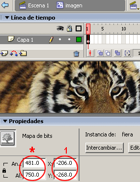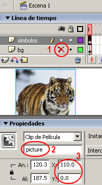 Ocultar la capa bg. Una vez reducida la imagen en el nombre instancia escribir picture y colocar esta imagen en X=110 y Y=0