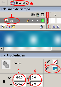 Regresar a la escena ya que será en esta parte en donde se desarrollara el resto del trabajo. Comenzar por cambiar el nombre a la capa 1 por bg, en esta capa dibujar un rectángulo sin borde y de color de relleno el que elijas. El rectángulo deberá medir 310*500 píxeles colocarlo en X=0 y Y=0. Espero que no tengas mayor complicación hasta esta parte del tutorial.