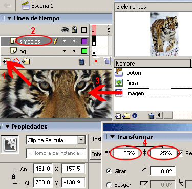 Insertar una segunda capa y nombrarla símbolos, en esta capa arrastrar desde la biblioteca el clip de película imagen, las coordenadas en donde quede ubicado no importa, hacer visible el panel de Transformar (presionar ctrl. + T), y reducir la imagen al 25 % tanto a lo ancho como a lo alto.