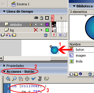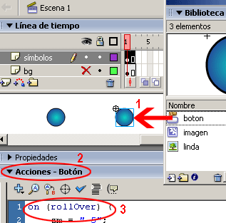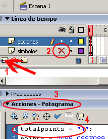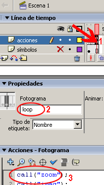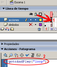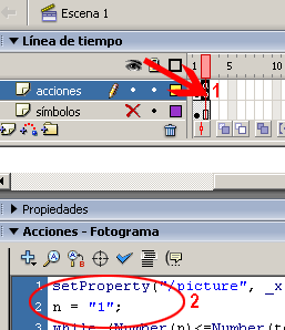 Agregar una tercera capa y nombrarla acciones, ocultar la capa símbolos. Seleccionar el fotograma y escribir en el panel de acciones-fotograma.