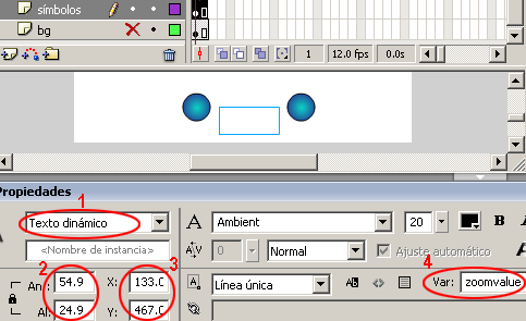 Insertar un campo de texto dinámico las dimensiones variaran dependiendo del tamaño de la fuente y el tipo de letra que sea utilizada, en la opción Var:zoomvalue. Colocar el campo de texto en medio de los dos botones como se muestra en la imagen.