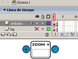 Para terminar con el diseño de los botones, agregar solamente un texto estático + y otro – para cada uno de los botones, un texto zoom % y un margen que encuadre a los textos.