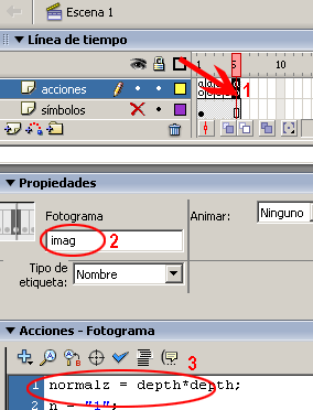 Insertar otro fotograma vacío en el frame 5 (F7), etiquetar este fotograma con el nombre de imag, además de escribir en acciones-fotograma.