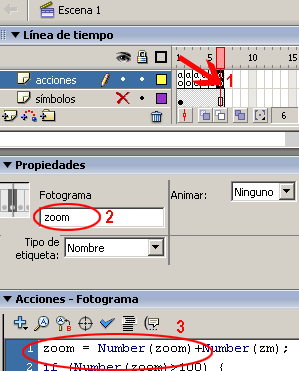 Insertar otro fotograma vacío en el frame 6 (F7), etiquetarlo con el nombre de zoom. Y escribir el siguiente código.