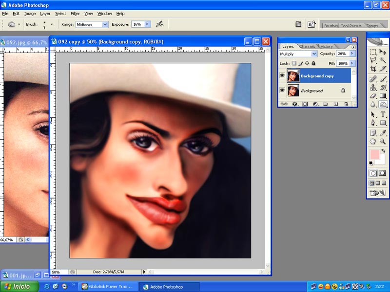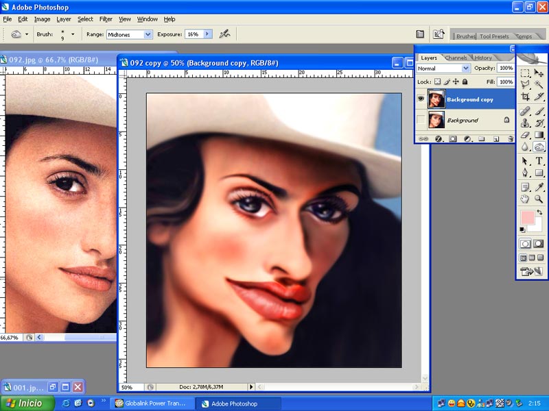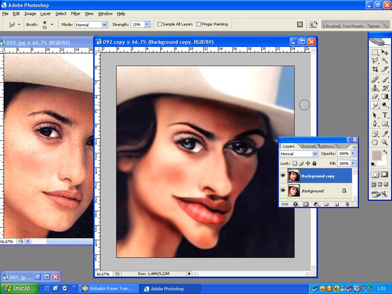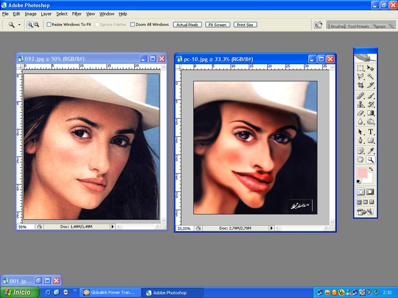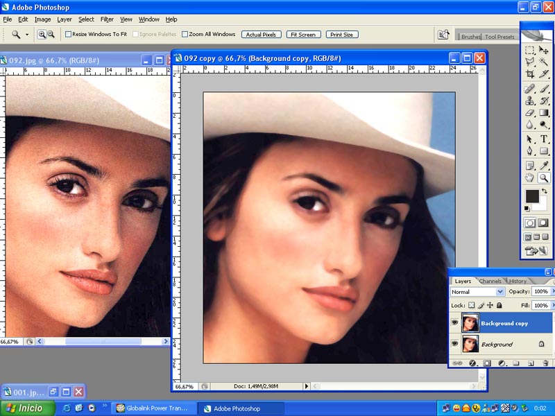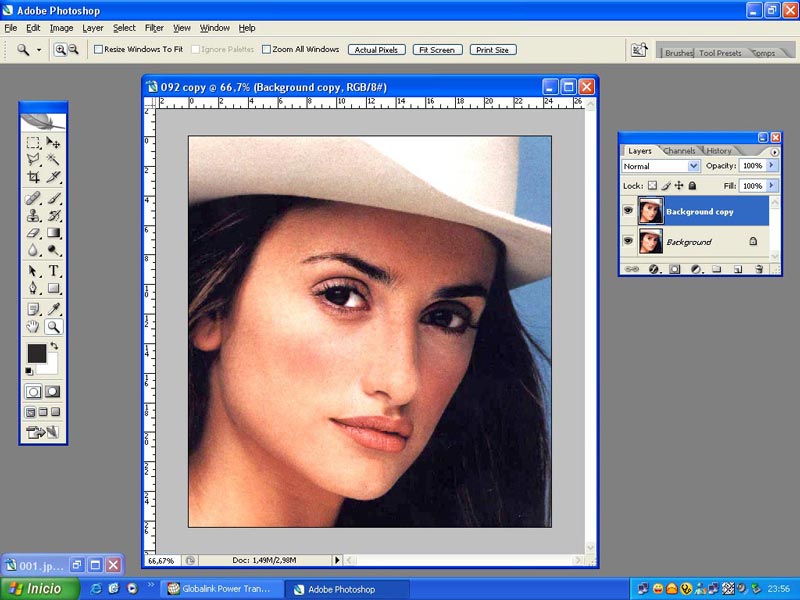 Empezamos seleccionando una buena fotografía, en cuanto a tamaño y nitidez. Seleccionamos a Penélope Cruz para el Concurso de karikamanía en Portugal. 1.-Abrimos la fotografía en el escritorio. Duplicamos la capa.