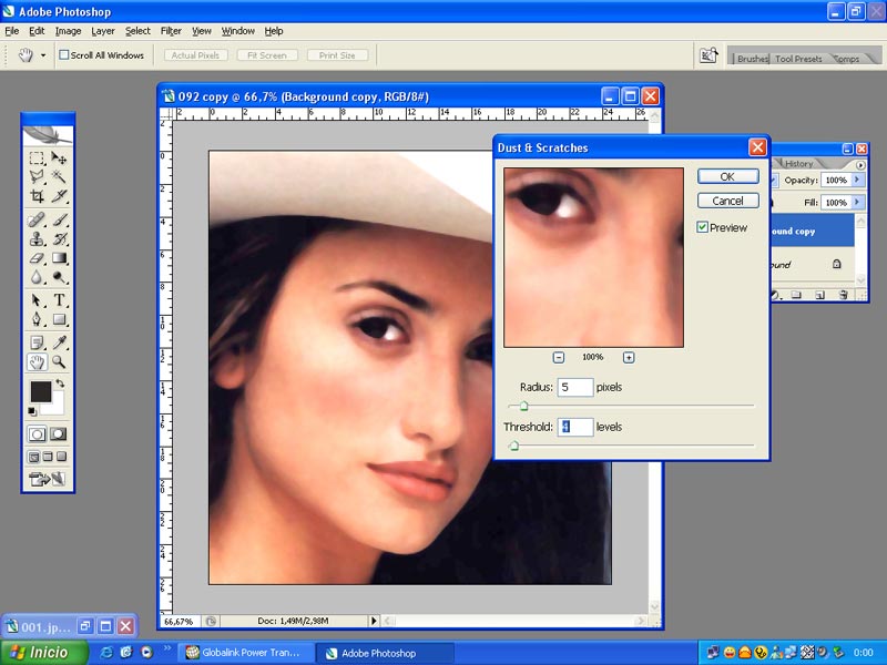 2.-A la segunda capa aplicamos elfiltro Noise en Drust&Scratchescon radius: 5 pix. y thresholdt : 4 levels. Tendremos una imagen como si estuviera pintada, desapareciendo lo real de la fotografía.