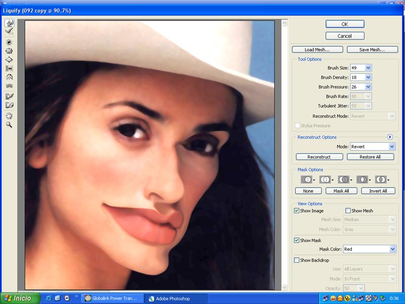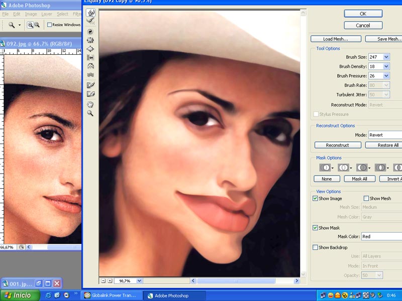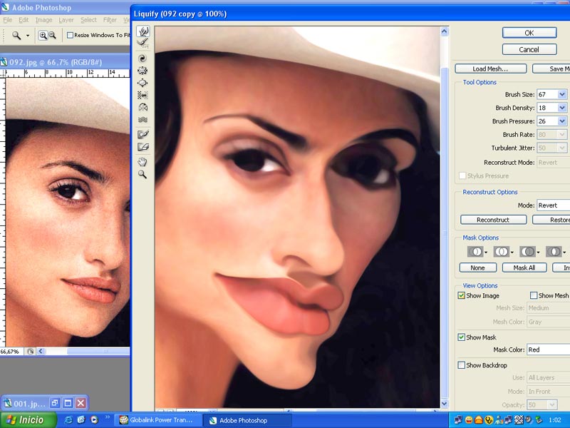 3.-Aplicamos el filtro Liquifycon: Aquí tenemos que recordar nuestros conocimientos de dibujo y técnicas con el pincel, pues vamos a jugar como si estuviéramos dibujando o pintando en las partes del rostro que queremos caracterizar, no deformar ni ridiculizar. Resaltar al personaje para que no pierda lo principal: su parecido y su personalidad