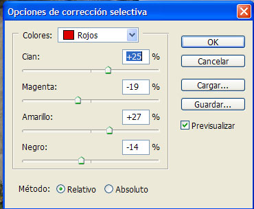 Color rojo: cian: +25, magenta: -19, amarillo: +27, negro: -14;