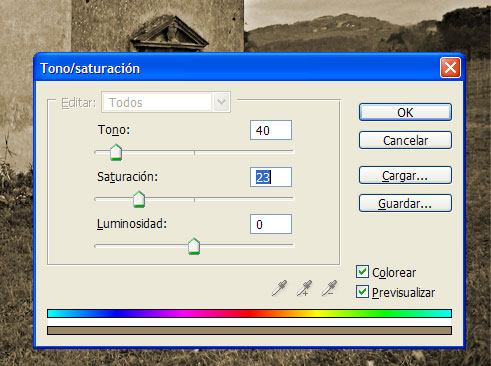 Ahora duplicamos la capa “fondo copia” (ctrl.+j) y la arrastramos por encima de las dos capas de ajuste; quedando esta como primer visible. Ahora vamos a “Tono/Saturación” y agregamos los siguientes valores para crear una imagen Sepia: