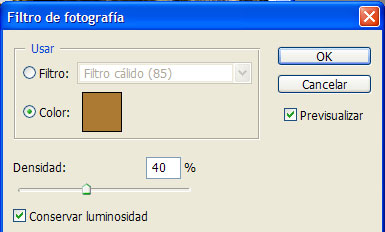 Seleccionamos ahora la capa “matiz” y de nuevo creamos una capa de ajuste, pero esta vez seleccionamos “Filtro de fotografía” con los siguientes valores: