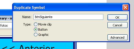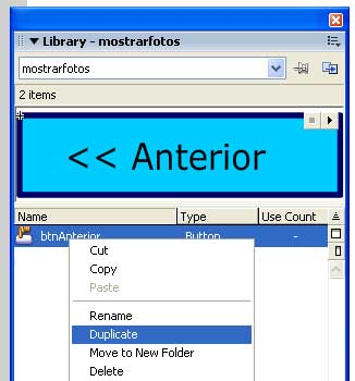 el botón siguiente es igual al de anterior para ello en la librería del documento (window, library o CTR L) hacemos botón derecho duplicate como indica la imagen