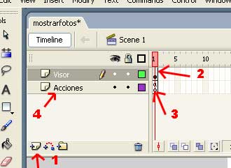 Bien, lo siguiente es organizar un poco el documento, para esto (1) agregaremos un nuevo layer, el anterior es el layer 1 que contiene los elementos gráficos hasta ahora realizados (2), luego en este layer agregaremos las acciones de programación Action Script (3), por ello al layer 1 le pondremos el nombre "Visor", dandole doble click en el nombre actual, y al layer 2 le daremos el nombre "Acciones" también con doble click (4)