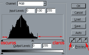 | Segunda.- Ahora veamos que es lo que hace el automático, haciéndolo manualmente. En la imagen superior de Levels, vemos indicados con pequeños flechas un par de goteros, uno con punta negra y otro con punta blanca. Toma el primero (negro) y con la punta de este toca la parte mas oscura de tu imagen (busca un negro); haz lo mismo con el gotero de punta blanca solo que ahora busca la parte mas clara de la imagen. Los lugares de muestreo de esta imagen están marcados con un pequeño circulo en la primera imagen. Veamos ahora los resultados. |