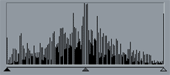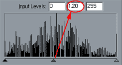 | Para esto hay solo que hacer cambios en los Leves (niveles) Image > Adjust > Levels Esta es la radiografía de nuestra imagen, y el diagnóstico es, como puedes ver, que tenemos una imagen pobre tanto en claros como en oscuros. En una imagen nítida, lo claros y oscuros cubren totalmente el recuadro, pero en esta no es así: las líneas de doble cabeza de flecha indican los espacios que debemos llenar para tener una imagen nítida. |